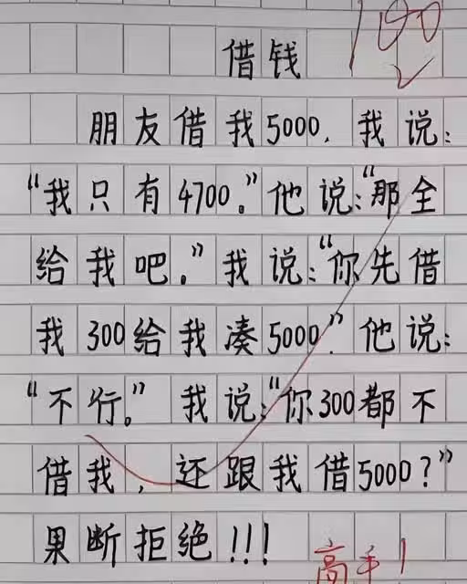 近日,有一篇小學生滿分作文走紅,題目叫《借錢》,這個題目其實有些成人化,可不知為何,卻被真正的小學生寫得朗朗上口,還在不知不覺之間解決了成年人都苦惱的問題。