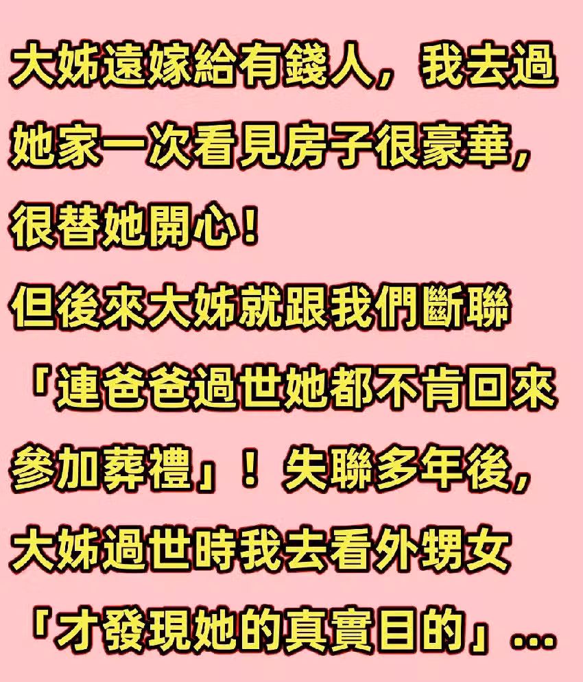 大姐遠嫁給有錢人,我去過她家一次看見房子很豪華,很替她開心! 但後來大姐就跟我們斷聯「連爸爸過世她都不肯回來參加葬禮」!失聯多年後…大姐過世時我去看外甥女「才發現她的真實目的」…