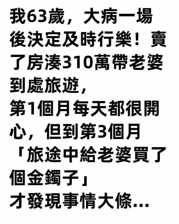 我63歲,大病一場後決定及時行樂!賣了房湊310萬帶老婆到處旅遊,第1個月每天都很開心,但到第3個月「旅途中給老婆買了個金鐲子」,才發現事情大條