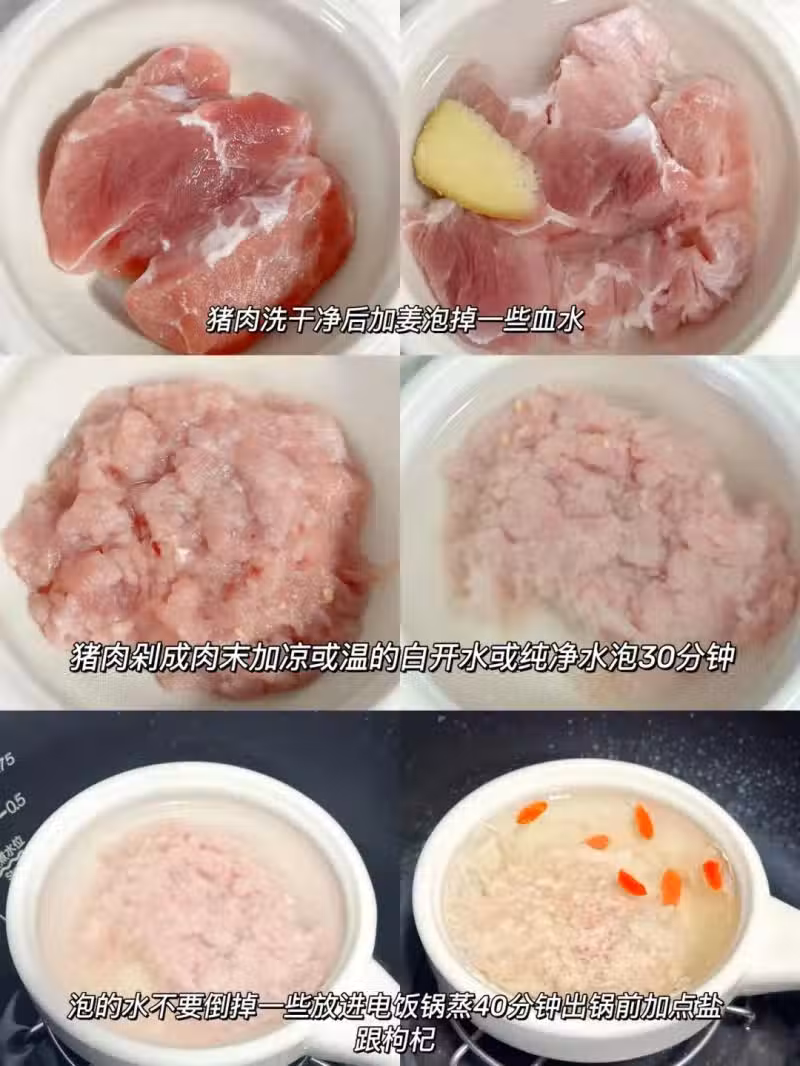 2️⃣ 把肉剁成細末末,加溫乎的白開水泡半小時(水別倒!)。