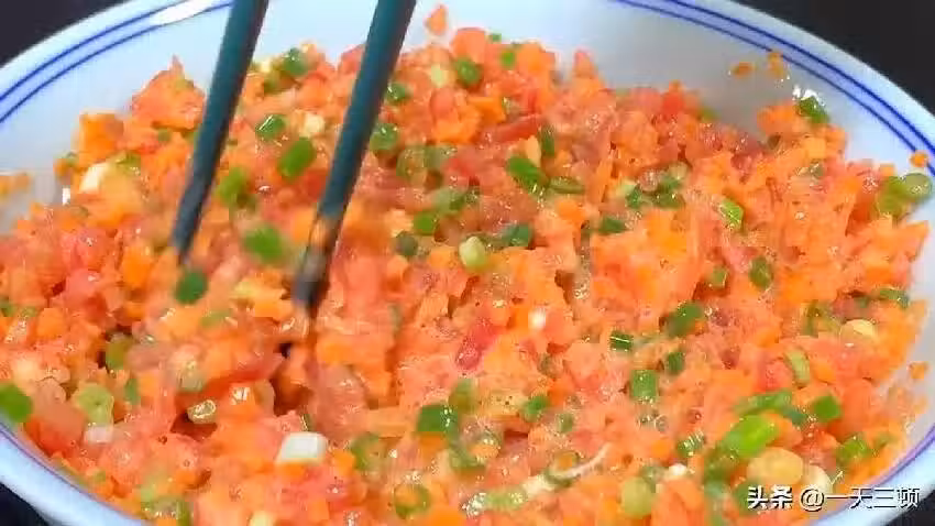 準備一把小蔥切成蔥花放胡蘿蔔里,然後往西紅柿里打一個雞蛋攪拌均勻。