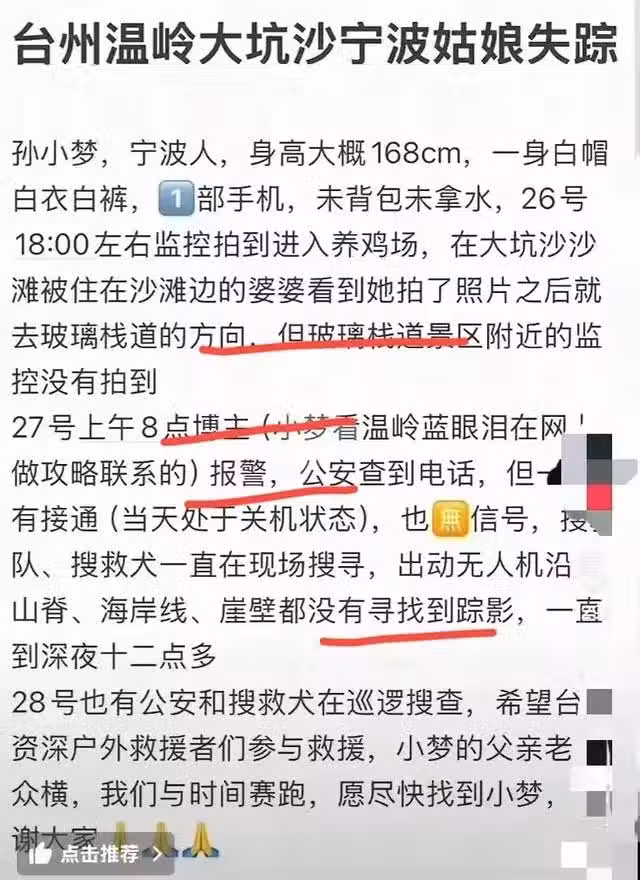 尤其是孫女士失聯後的兩天,當地氣候又下了雨,刮大風,她又沒帶行動電源和備用物資,真是太莽撞了啊。俗話說得好,君子不立於危牆之下。藍眼淚再好看,也比不過自己的生命安全重要啊。孫女士為了看藍眼淚,不惜在天快黑的時候孤身前往人之罕至的地方,真是太大意了啊。