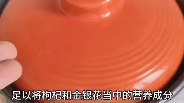 現在砂鍋的鍋蓋它特別特別的燙,不要直接用手來揭開,我們需要用毛巾給它包起來,揭開的一瞬間,你會聞到特別濃郁的香味兒,沒錯這就是黃芪和枸杞,以及金銀花煮過的味道,可以看見裡面的水已經變成了棕色,這也是因為,食材當中的營養成分已經被徹底的煮出來了。