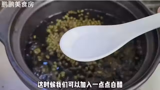 最後把白醋攪拌均勻,然後再次將鍋蓋蓋上,將火轉成中火或者小火,煮上15到20分鐘,時間到了之後再次揭開,現在你會聞到濃濃的綠豆香味,可以看見現在的綠豆已經被煮的軟爛開花了,看起來就非常的有食慾。