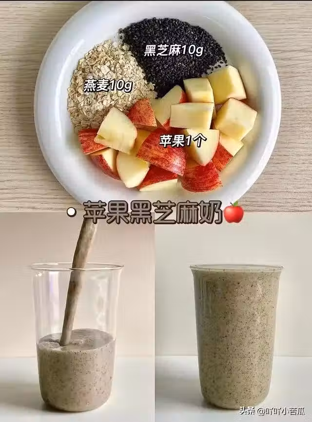 食材:青蘋果1個+熟黑芝麻10g+燕麥10g+清水350ml。