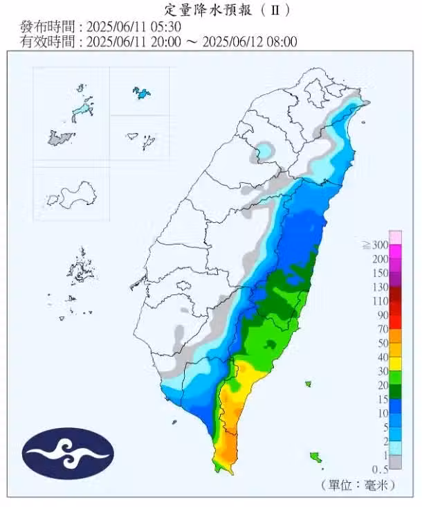 張承傳說,周四低壓帶北移,東部、東南部、南部有短暫陣雨或雷雨,並有局部大雨機率,東北部、中部地區有局部降雨,其他地區午後有局部短暫雷陣雨,中部、其他山區午後有局部大雨機率。