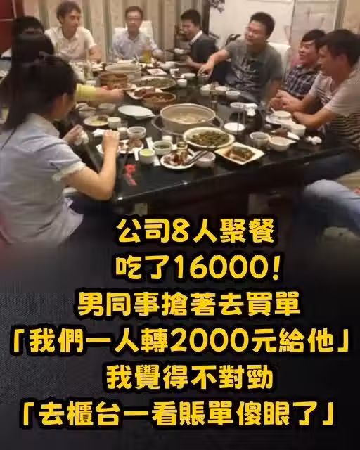 公司8人聚餐吃了16000! 男同事搶著去買單「我們一人轉2000元給他...」,但我覺得不對勁「去櫃檯一看帳單傻眼了」