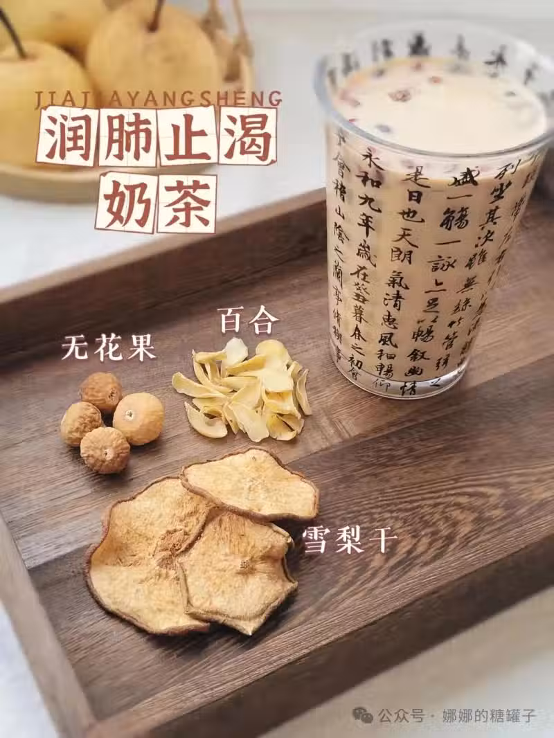 無花果:味甘,性平,歸肺、胃、大腸經。它能清熱生津,可緩解肺燥引起的咳嗽、咽喉腫痛等,改善津液不足導致的口渴 ,含有的成分對呼吸道黏膜有滋養作用。 百合:味甘,性寒,歸心、肺經 。能養陰潤肺,對於陰虛燥咳、勞嗽咳血等肺陰虛咳嗽症狀有效,還可通過滋陰來緩解因肺燥造成的口渴,有清心安神功效,利於改善因肺燥引發的心煩不安等情況。 雪梨乾:由雪梨製成,雪梨在中醫營養學中具有清熱化痰、生津潤肺的功效,能清除肺內的熱邪,滋養陰精,緩解肺熱咳嗽、咽干口渴等症狀 。製成雪梨乾後,仍保留這些功效,可幫助潤肺止渴。
