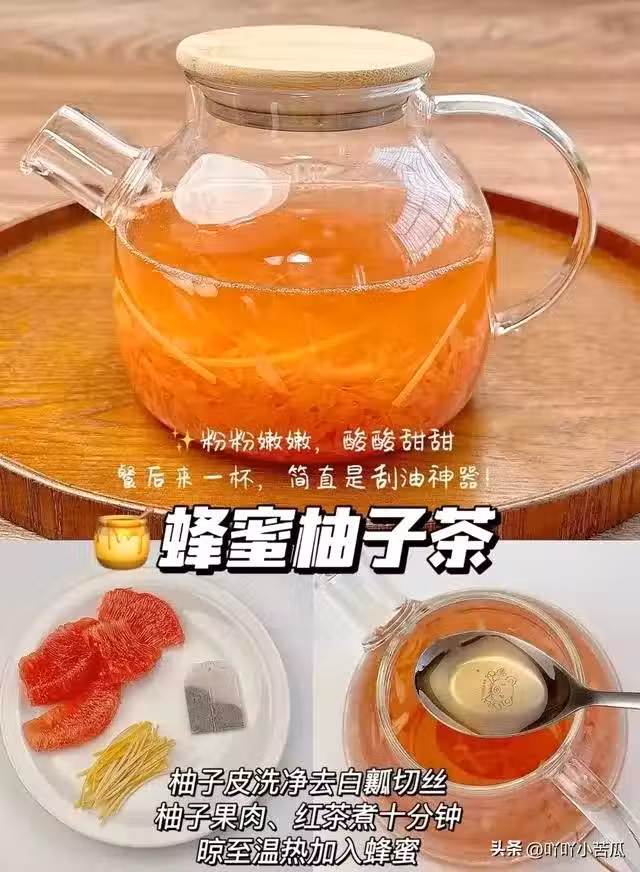 做法:柚子肉+紅茶煮10分鐘,晾至40℃加蜂蜜。