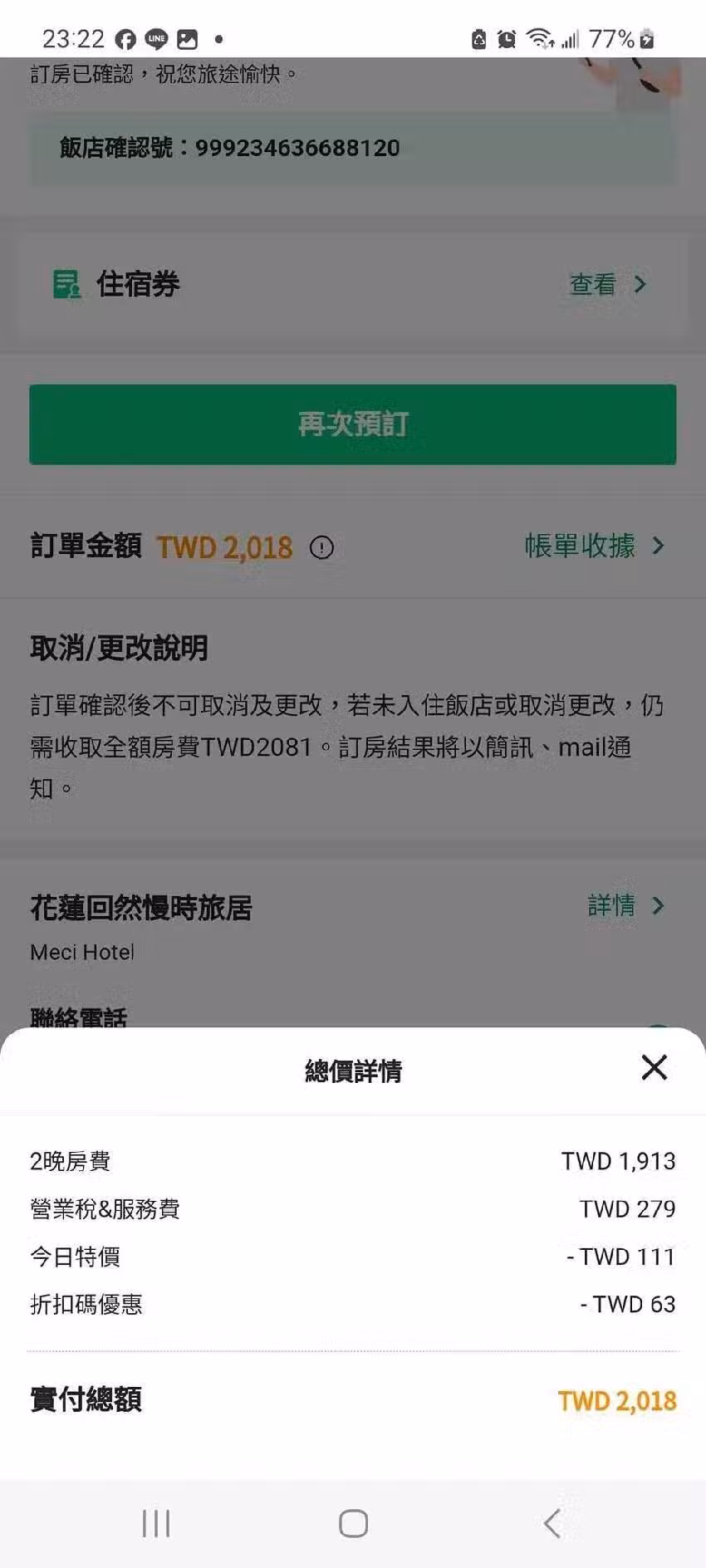 原PO在臉書社團「好想住飯店好 康、踩雷不藏私」中發文分享,她近日到花蓮旅遊,投宿某飯店住雙人房,2天房費竟只要2018元,使用住宿補助後實付僅18元,雖然沒有早餐跟浴缸,但早餐可加購一人100元,房間大小適中、清潔度也過關,加上離花蓮火車站也很近,走路只要5分鐘,是很值得回訪的飯店!