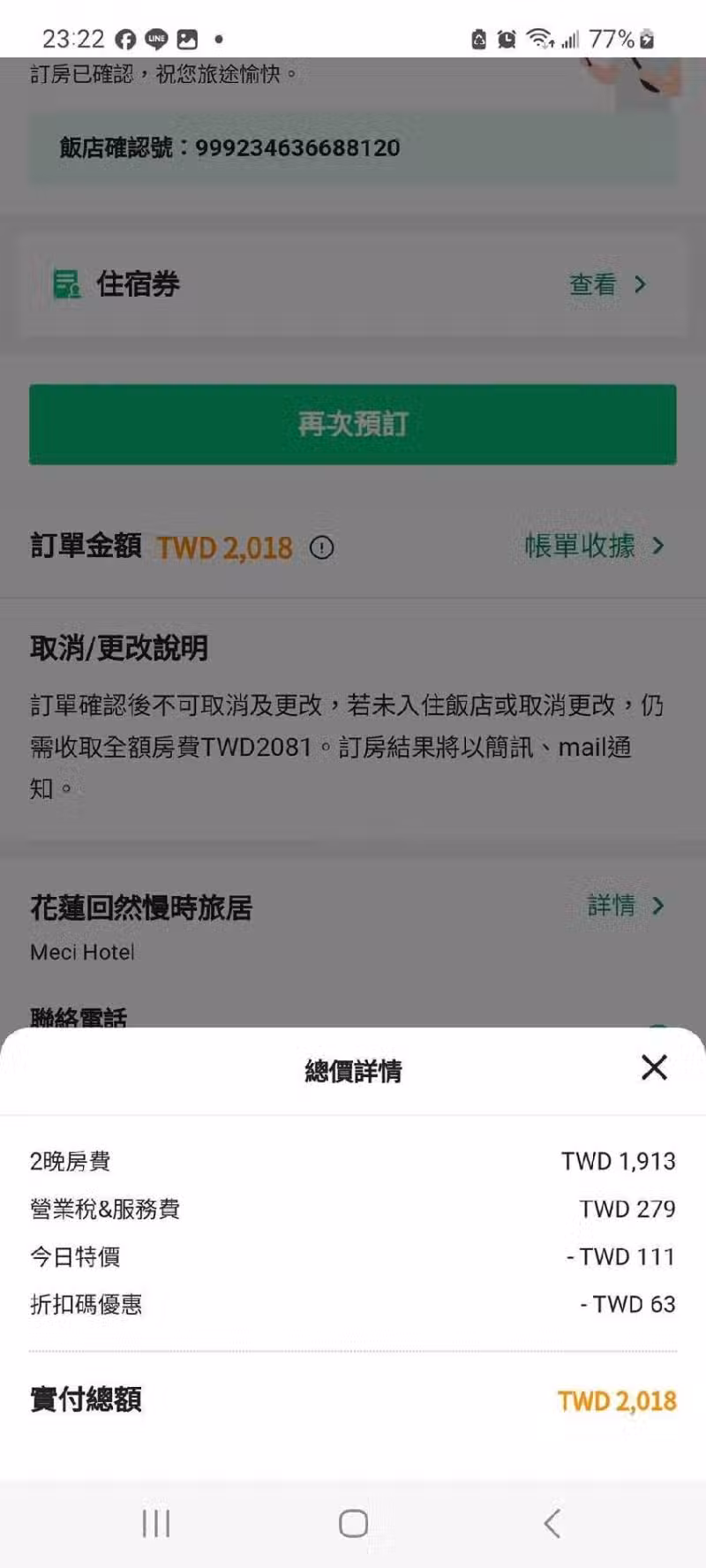 原PO在臉書社團「好想住飯店好 康、踩雷不藏私」中發文分享,她近日到花蓮旅遊,投宿某飯店住雙人房,2天房費竟只要2018元,使用住宿補助後實付僅18元,雖然沒有早餐跟浴缸,但早餐可加購一人100元,房間大小適中、清潔度也過關,加上離花蓮火車站也很近,走路只要5分鐘,是很值得回訪的飯店!
