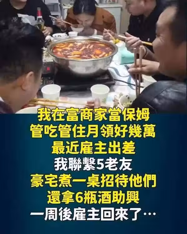 我在富商家當保姆,管吃管住月領好幾萬,最近僱主出差,我聯繫5老友、豪宅煮一桌招待他們,還拿6瓶酒助興,一周後僱主回來了!