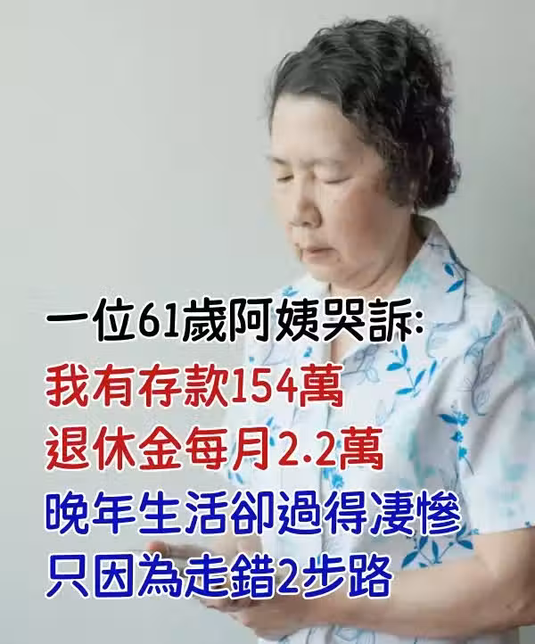一位61歲阿姨哭訴:我有存款154萬...退休金每月2.2萬,晚年生活卻過得悽慘,只因為走錯2步路...