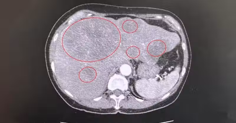而陳周誠也透過大腸鏡檢查診斷,婦女直腸上段三分之一處有一顆約7公分大的癌腫瘤,並轉移至肝臟,腹部電腦斷層掃描也看見肝臟布滿大大小小,由1公分到6.5公分不等的直腸癌轉移腫瘤。