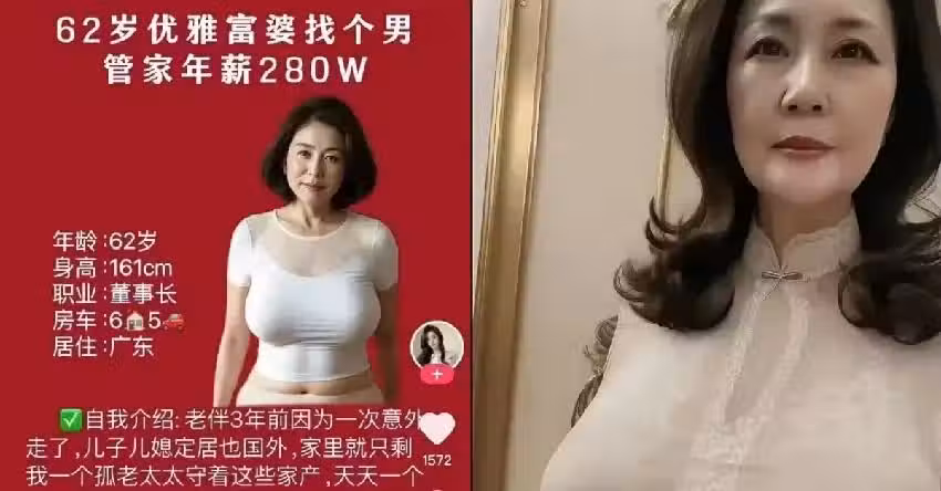 近日,一段抖音貼文在網絡上瘋傳,內容是一名 62 歲的優雅富婆徵求男管家,開出年薪280萬人民幣(約台幣1250萬)的優渥條件,立刻引起熱烈討論。