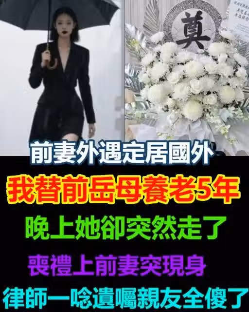 前妻外遇定居國外,我替前岳母養老5年,晚上她卻突然走了,喪禮上前妻突現身,律師一念遺囑親友全傻了...