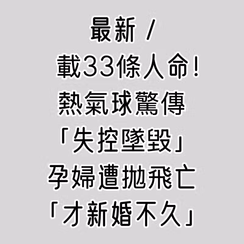 最新/載33條人命!熱氣球驚傳「失控墜毀」 孕婦遭拋飛亡「才新婚不久」