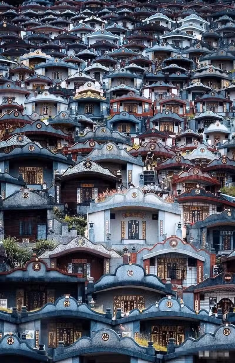 這張照片拍攝的台北墓地群,以其密集的布局和獨特的建築風格吸引了眾多目光。 墓碑之間的間距極小,層層堆疊向上延伸,形成了一種近乎「垂直墓園」的視覺效果。
