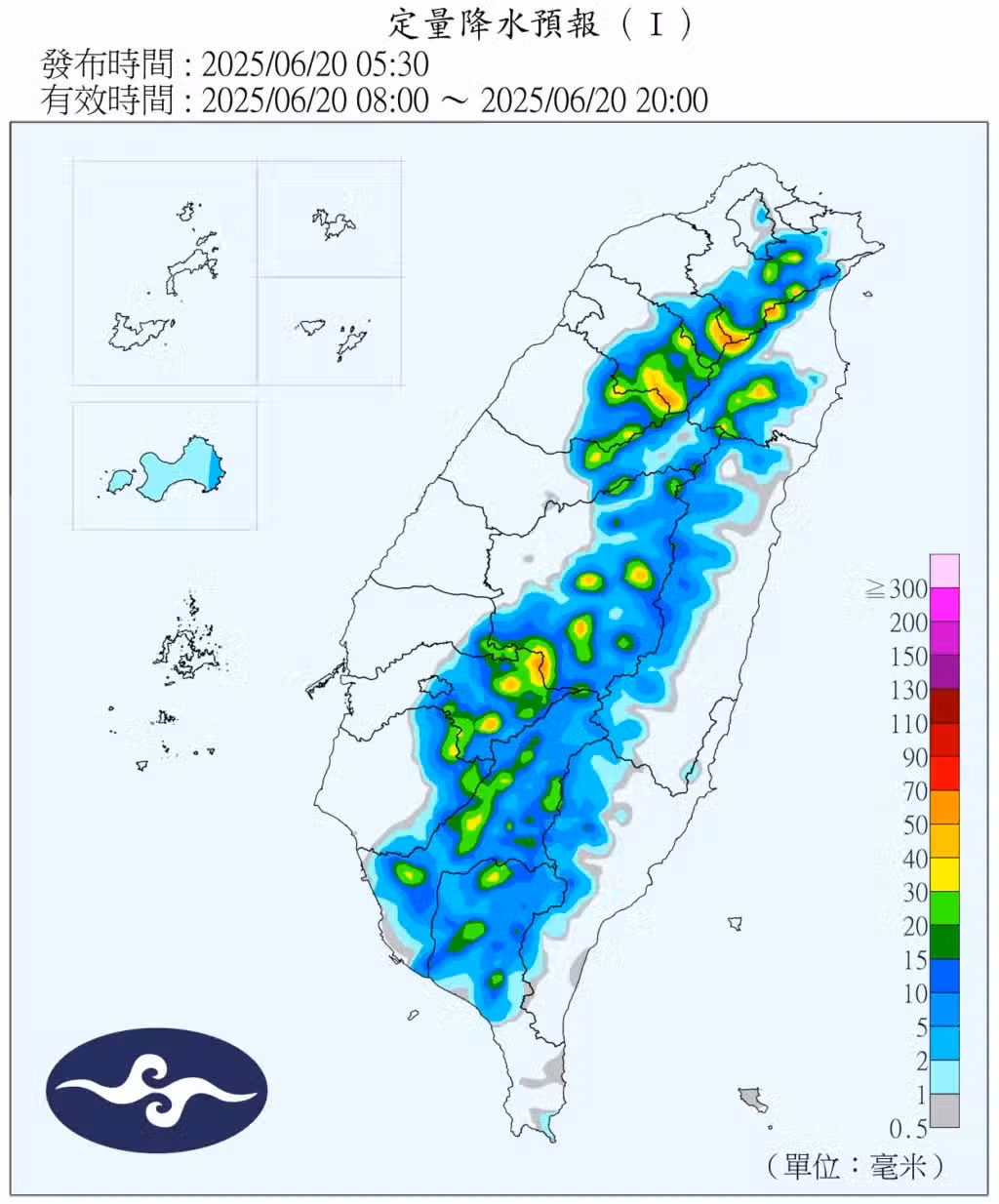 明日 (21) 午後中部以北、東北部地區及其他山區有局部短暫雷陣雨,清晨至上午中南部地區亦有零星短暫陣雨;今、明兩天午後西半部山區有局部大雨發生的機率。