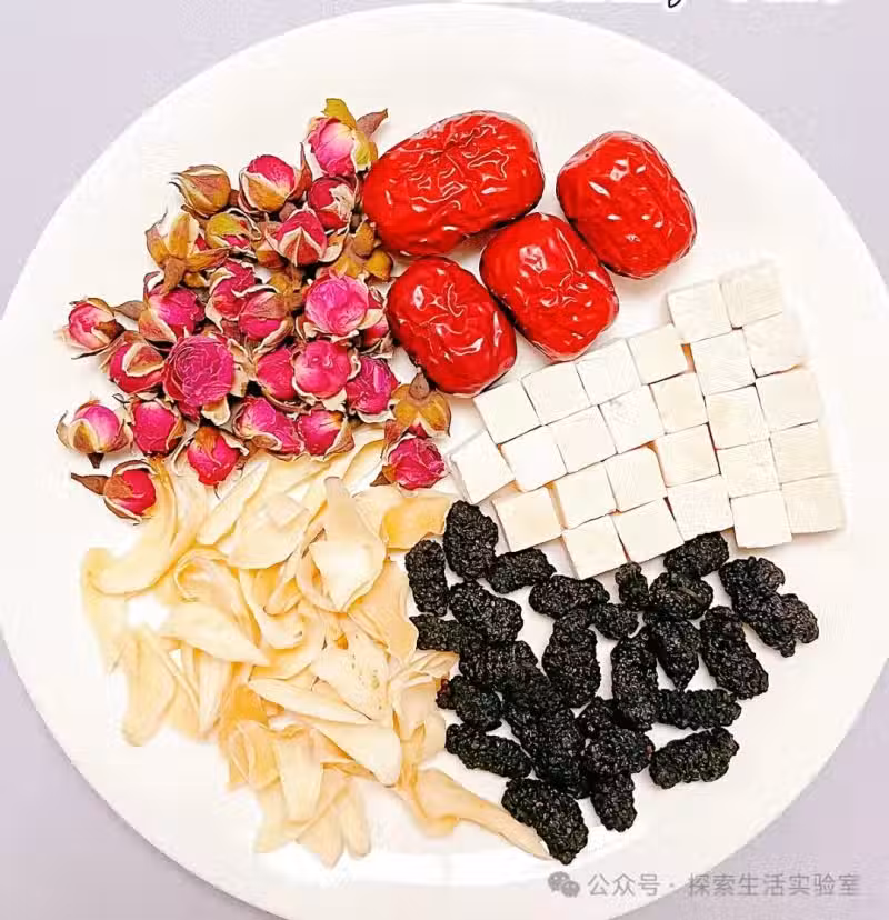 桑葚干、玫瑰花、茯苓、百合、紅棗