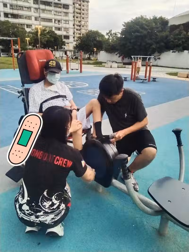 廖錦德今日在Threads發文曝光父親近況,畫面中可以看到,廖峻帶著口罩和鴨舌帽坐在輪椅上,身體用固定帶固定,身形消瘦一大圈,在兒子的幫助下,使用器材復健,進行腿部運動,廖錦德舉起父親的腳幫忙固定,畫面中廖峻雙腿消瘦,粗細幾乎和兒子手臂差不多。