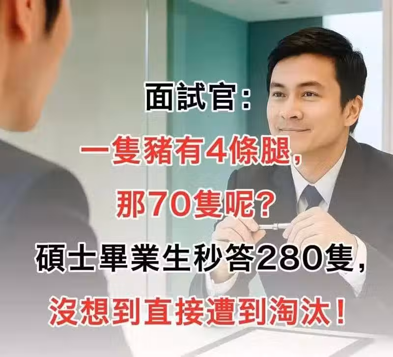 面試官:一隻豬有 4條腿,那 70隻呢? 碩士畢業生秒答 280隻,沒想到直接遭到淘汰