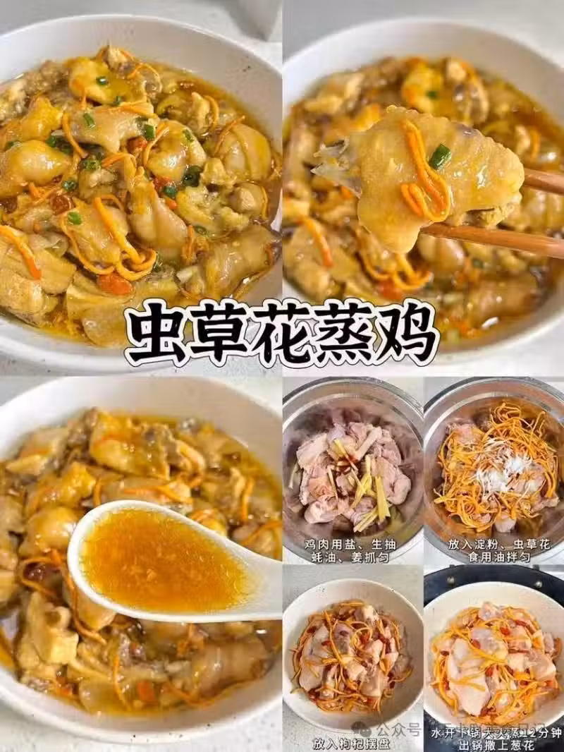 雞肉用鹽、生抽、蚝油、姜抓勻;放入澱粉、蟲草花、食用油拌勻;放入枸杞擺盤;水開下鍋大火蒸12分鐘出鍋撒上蔥花。