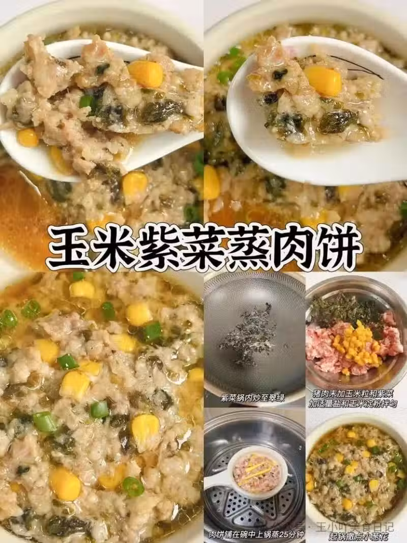 食材:豬肉末200克、玉米粒50克、紫菜5克、玉米澱粉1勺、鹽半勺、蔥花適量
