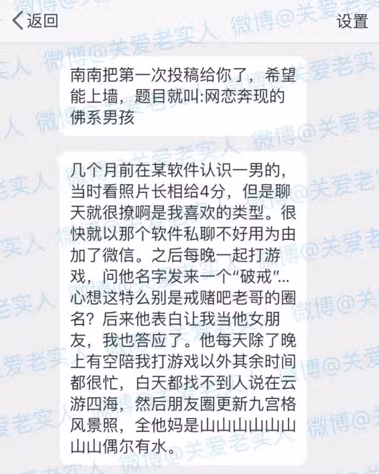 儘管現在網絡交友是很普遍的事,但同時網絡詐騙也很多,務必要當心、慎選!先前中國微博博主「@關愛老實人」就分享了一則粉絲投稿,這名女網友表示自己在交友軟體上和一名男子網戀,後來雙方約出來見面時,女網友赫然發現對方竟是一名「和尚」!女網友透過私訊向博主投稿指出,當初在交友軟體遇見這名「佛系男孩」時,雖然對方顏值不怎麼高,但因為聊天時「很會撩」、把她撩得整個春心蕩漾,所以她便主動提出交換微信繼續私聊,並且也每天一起打線上遊戲,過了一陣子對方也向她告白,兩人就這麼談起網戀。而熱戀中的人總是想更了解戀愛對象,女網友問過對方叫什麼名字,對方只回「破戒」,她也樂天地想說就是個網名吧,另外男方的動態更新也總是發一些山上的風景照,她雖然有些傻眼,但當時並沒有想太多。