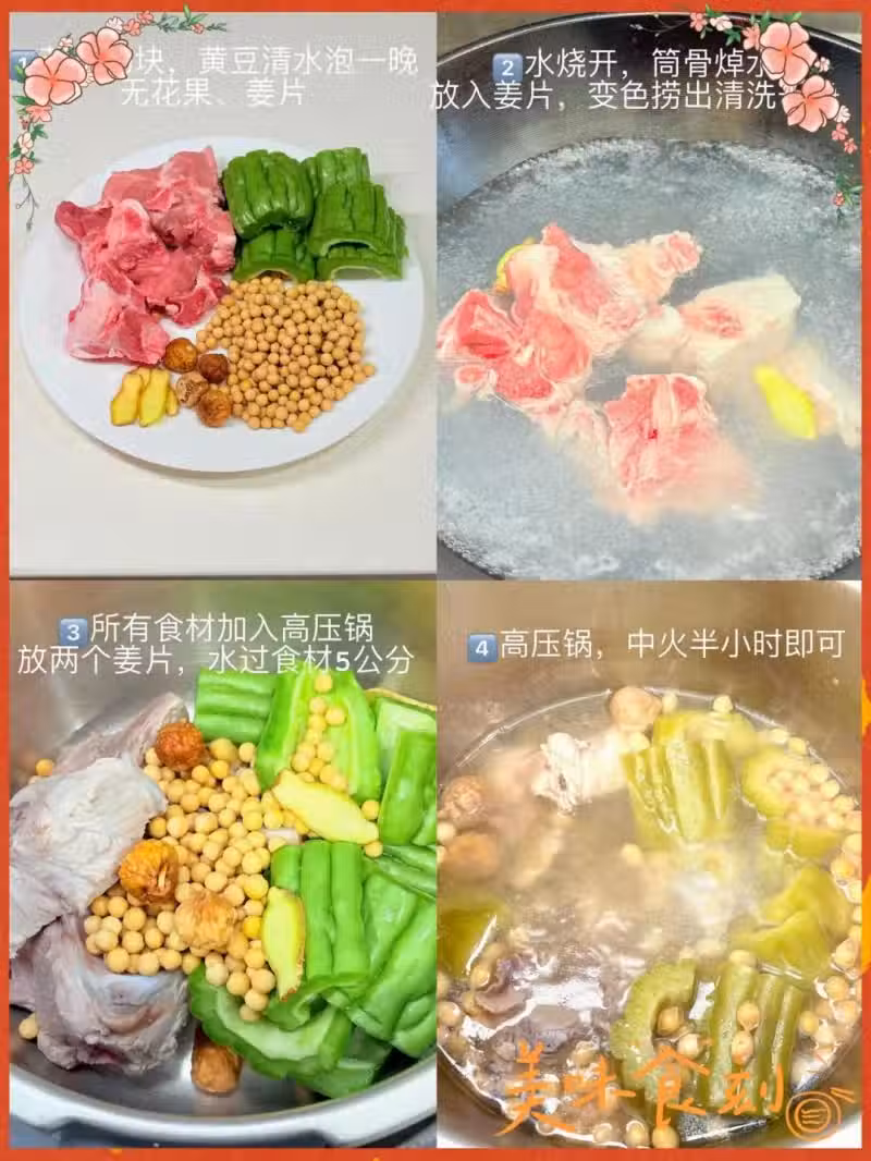 苦瓜2根、豬排骨400克、干黃豆80克、