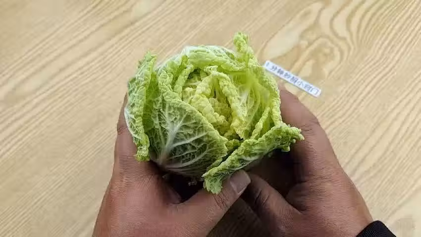 如果我們捏起來比較緊實,外觀看上去也非常飽滿,除了外面的幾片葉子比較鬆散之外,裡面的菜葉都是緊緊地包裹在一起,看到這種白菜,就說明這顆白菜裡面的養分比較足,白菜中心也是很緊實的,沒有出現空心,或者是腐爛的現象,這種白菜就是比較好,比較新鮮的白菜了。