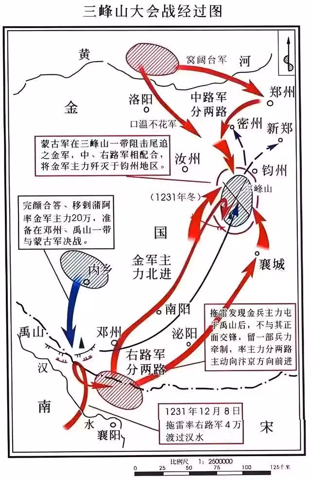 完顏合達全軍覆沒之後,這兩支金軍又在同一時間接到了金哀宗要求他們入汴京勤王的命令。然而,當駐守徐州的金軍,開進河南的地界之時,蒙古軍剛剛經過了三峰山的大勝,正風風火火的在河南境內橫掃汴京周邊的州縣。而徐州的金軍一來就這麼不巧的遭遇到這支掃蕩中原的拖雷和窩闊台聯軍。可憐這支金軍本來是為救援汴京而來,卻在救援的路上就被蒙古人消滅掉。