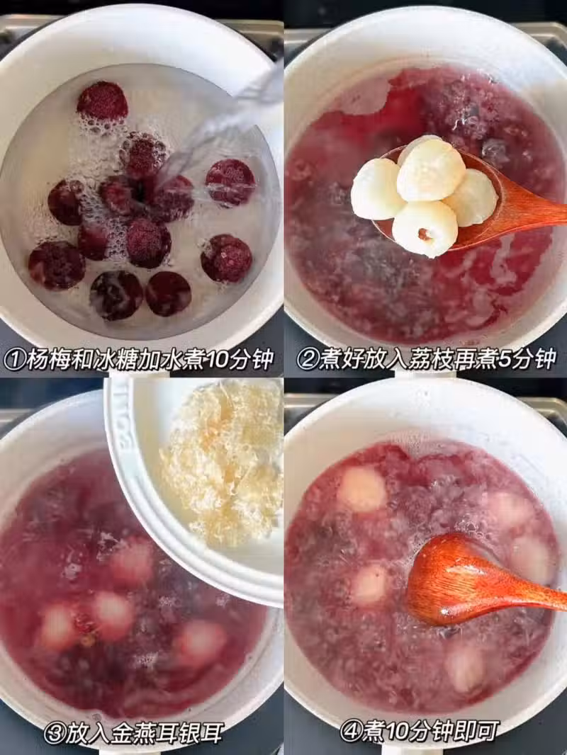 1️⃣、楊梅和冰糖擱鍋里,添小半碗水煮個十分鐘;