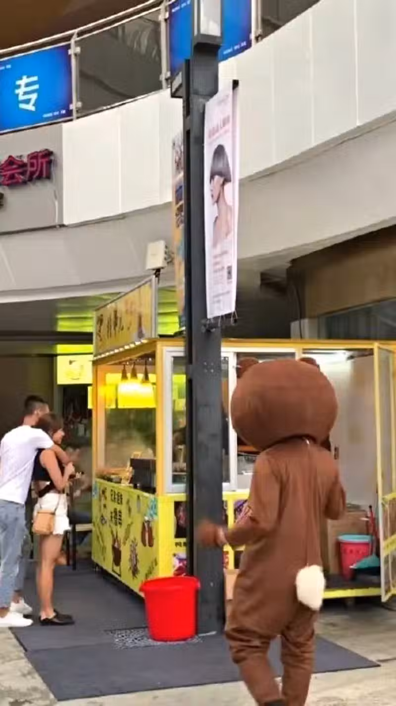 只見一系列照片中,穿著熊玩偶裝的男主角出現在一個公眾場合中,
