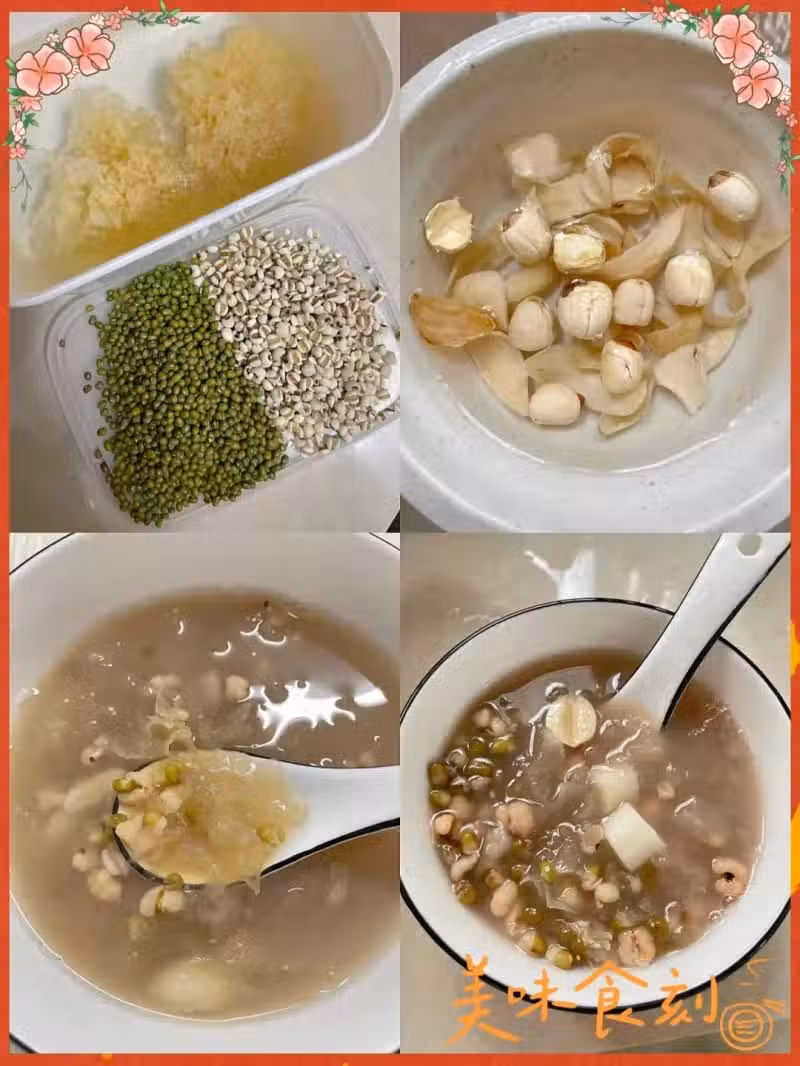 干銀耳半朵+綠豆50克+炒薏米40克+干百合10克+干蓮子15克+新鮮山藥100克