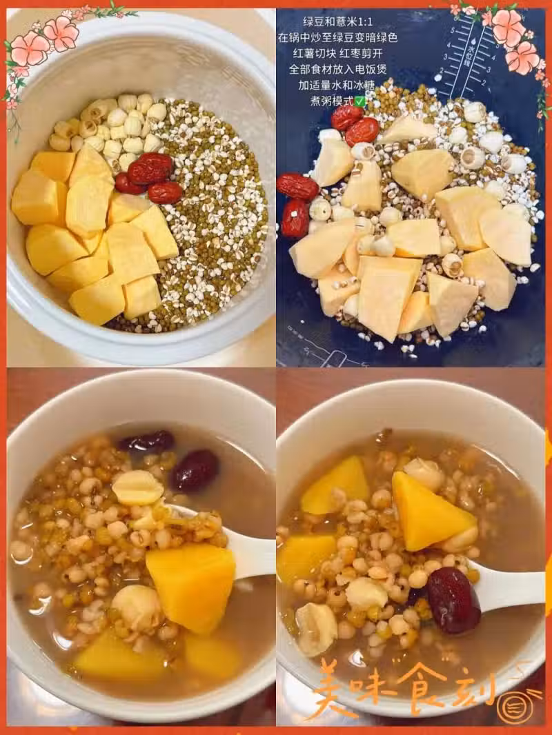 薏米40克+綠豆30克+紅薯200克+蓮子15克+紅棗6顆