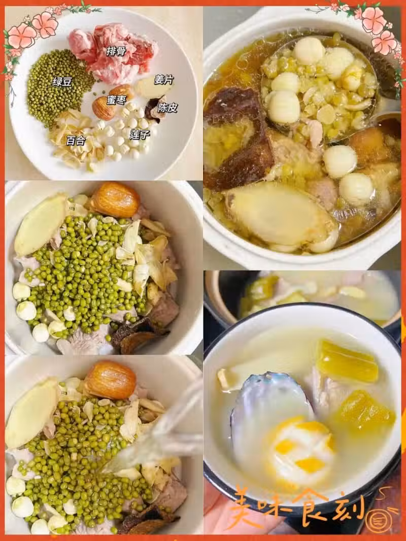 豬排骨400克+綠豆150克+蓮子30克+干百合20克+陳皮1片