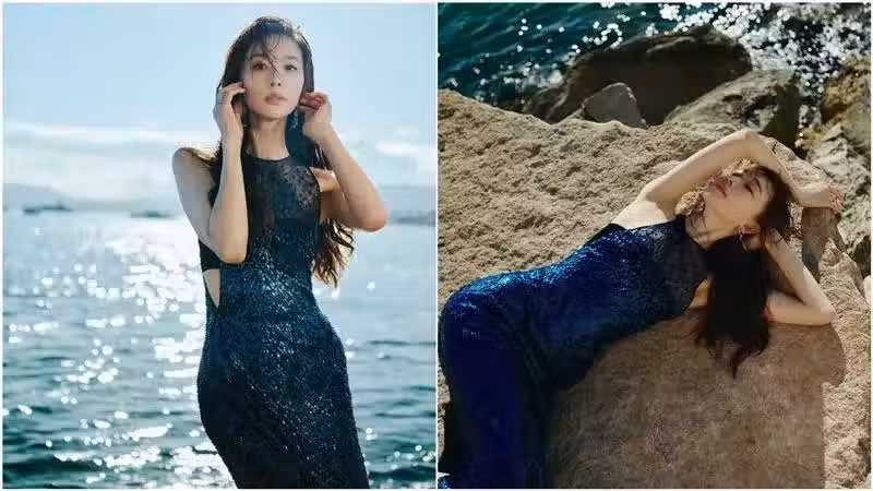 身穿一襲藍色閃亮禮服,搭配濕發造型,在海岸邊拍攝美照,宛如美人魚上岸,絕美畫面讓網友看呆,今也釋出幕後花絮短片。