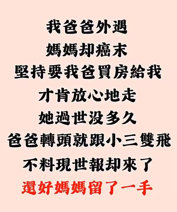 爸爸出軌 !患癌媽媽臨走前「要爸爸買房給我」媽媽走後「爸爸轉頭就跟小三雙飛...」 現世報卻來了