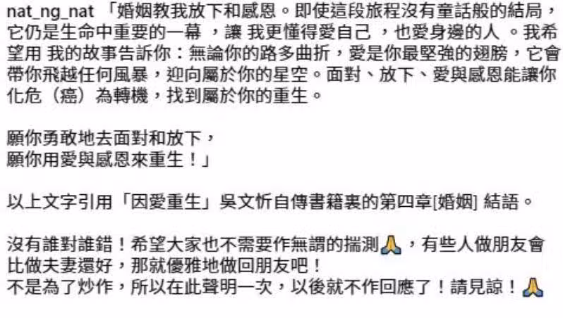 吳文忻應該也意識到在公開離婚,外界會有無謂的揣測,而她沒有向媒體透露具體原因,只在社交平台上低調回應稱,沒有誰對誰錯,希望大家不要做無謂的揣測,有些人做朋友會比做夫妻好,那就優雅地做回朋友吧。