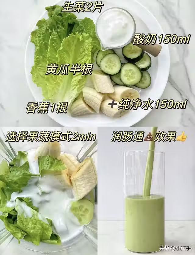 神奇效果:生菜和黃瓜的膳食纖維像小刷子掃腸子,香蕉+酸奶促蠕動,喝完一上午肚子都不餓,下午準時跑廁所,那種清空感太爽了誰懂!