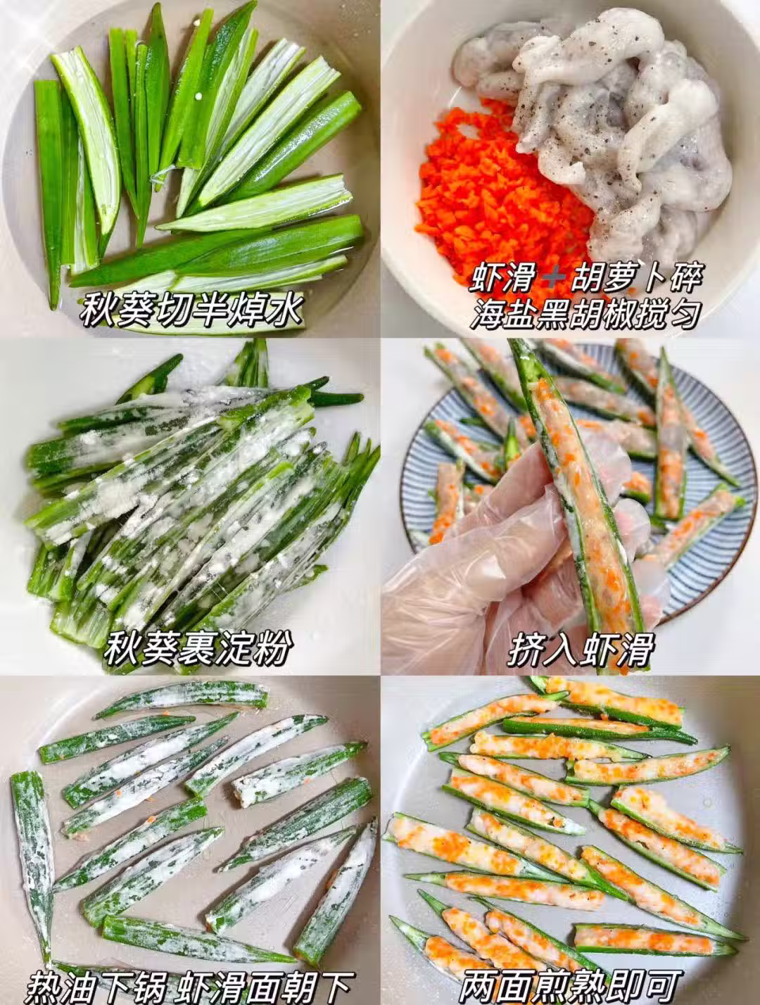 3. 秋葵裹一層澱粉(防滑),把蝦滑擠進去輕輕壓實。