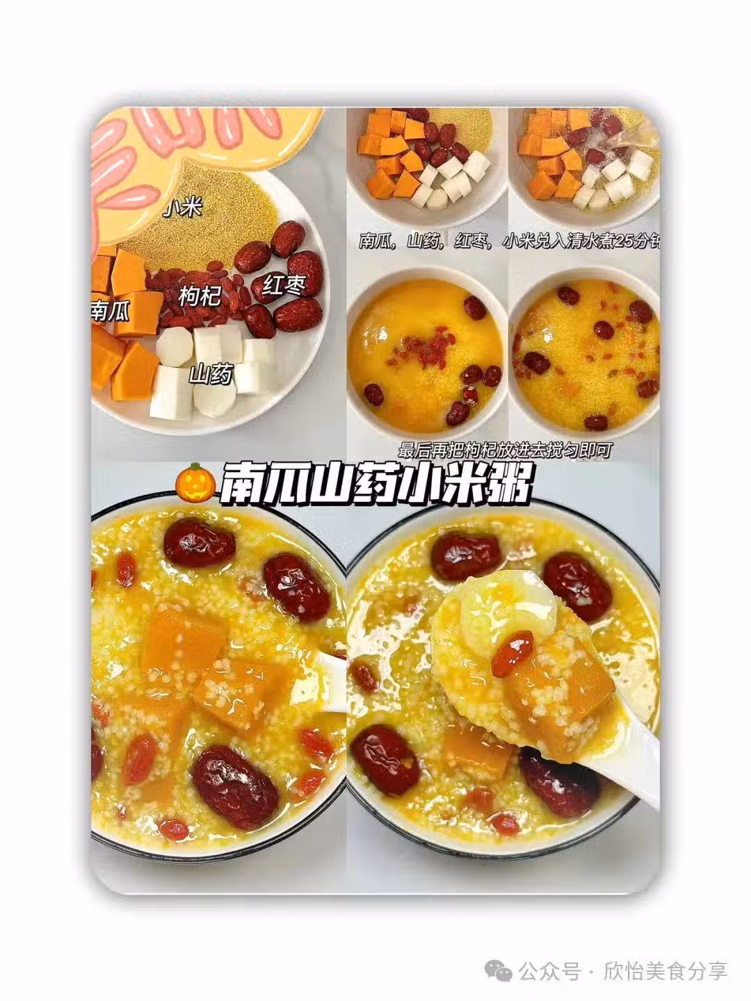 6、山藥南瓜小米粥,準備食材小米,南瓜,山藥,紅棗枸杞,南瓜山藥紅棗小米一起加入清水煮25分鐘,最後加入枸杞攪拌均勻即可健脾開胃南瓜含有豐富的鋅元素對人體有益!
