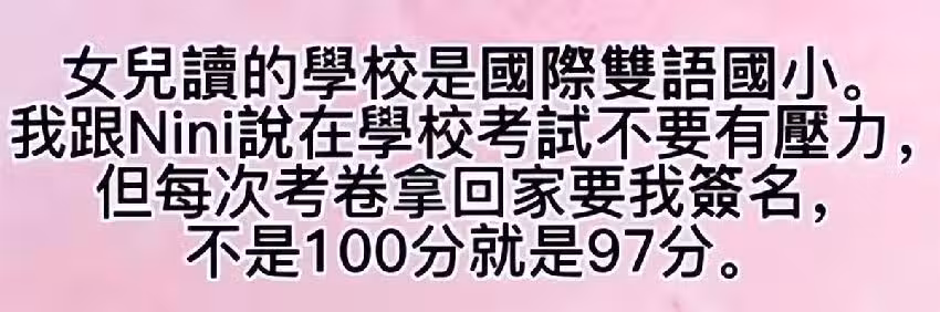女兒讀的學校是國際雙語國小,我跟寶貝說在學校考試不要有壓力,但每次考試回家她都拿著100分或者是97分給我簽名。