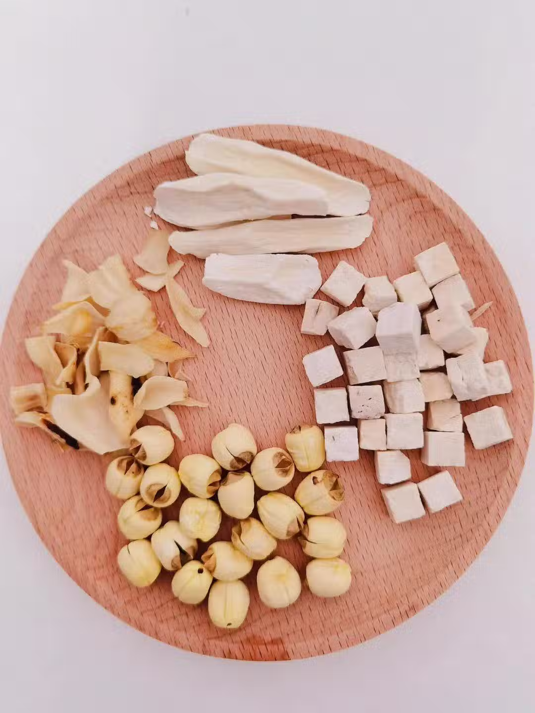 食材:懷山干、茯苓、百合、蓮子各20g。
