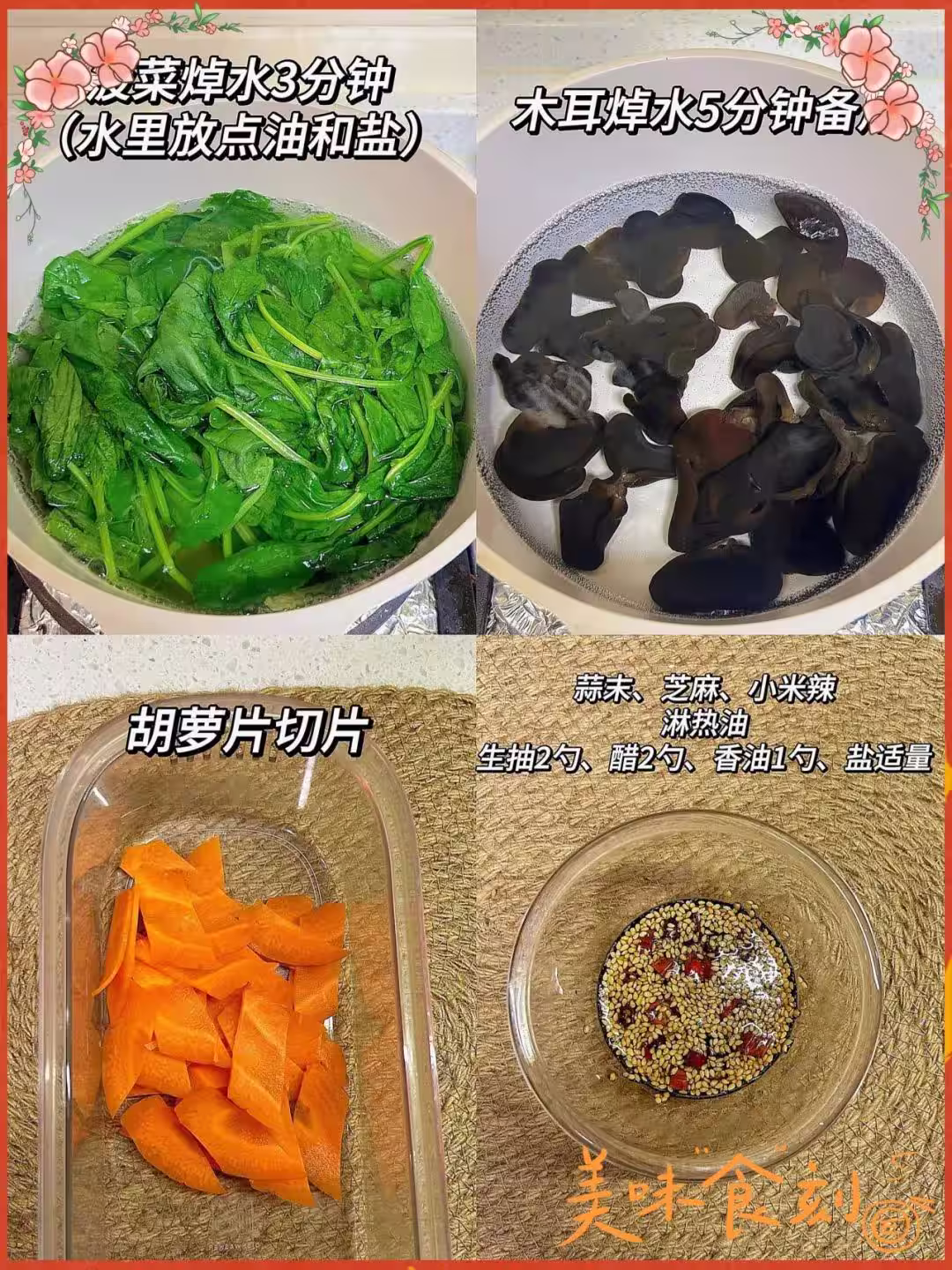 菠菜200克+木耳30克+胡蘿蔔50克+蒜末15克+白芝麻10克+小米辣2根