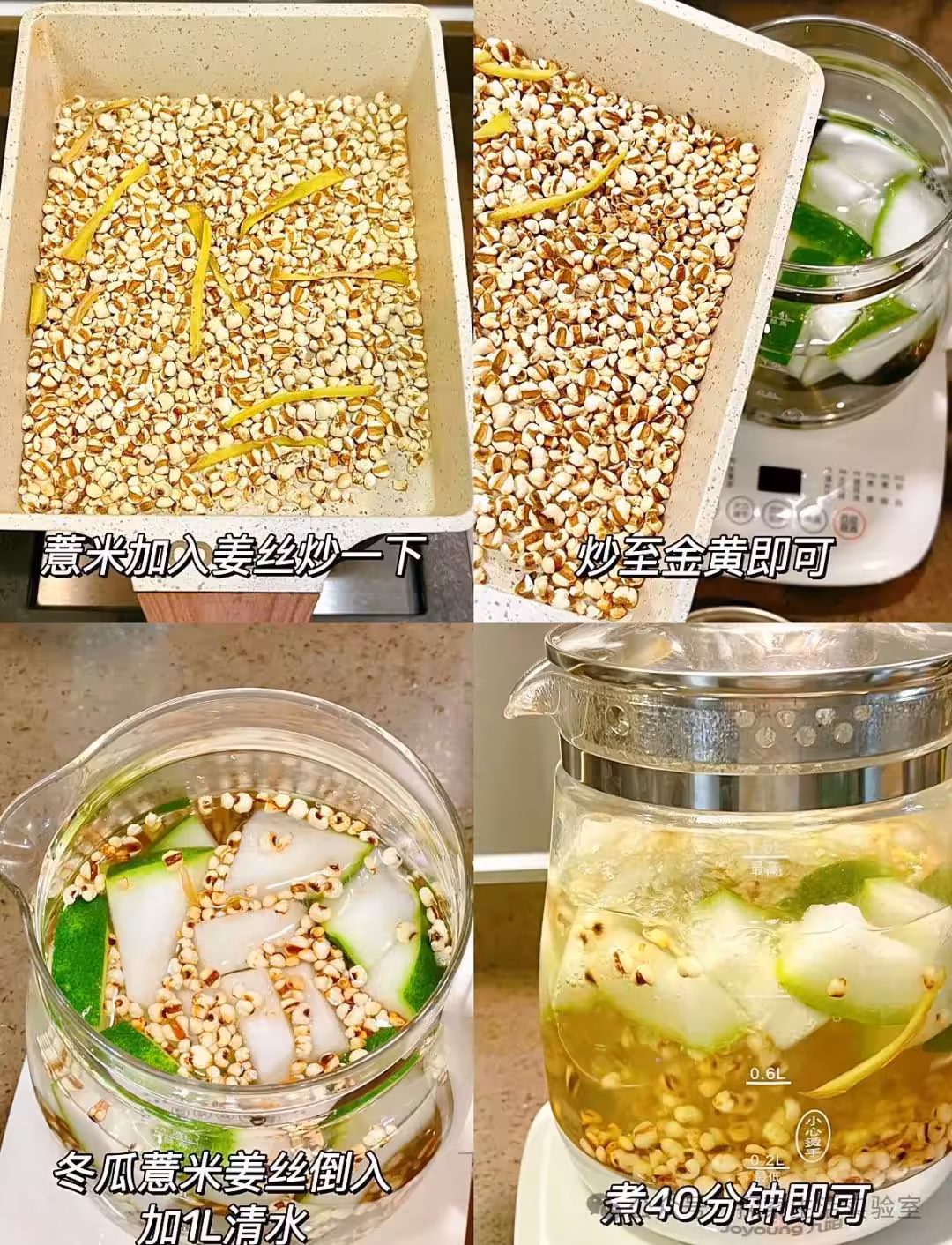 2️⃣冬瓜洗乾淨切塊 3️⃣把冬瓜➕薏米➕薑絲倒入養生壺中,加入適量水,開啟煮茶模式煮40分鐘即可