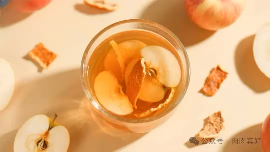 做法:蘋果1 個切塊,陳皮 3 克(泡軟把白瓤刮掉,不然太燥),加水煮 20 分鐘,吃完飯喝,別天天喝,喝幾天停一停