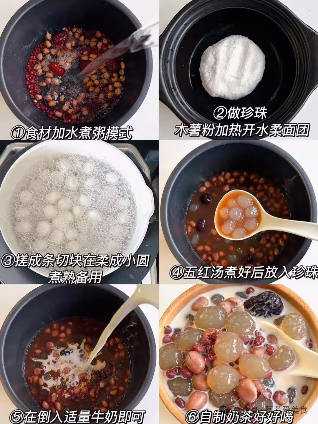 水開下鍋煮熟撈出,過涼水。粥煮好盛出,加入珍珠小圓子,再淋上適量牛奶。紅豆花生軟糯,牛奶溫潤,小珍珠彈彈的,喝完整個人都舒坦了。