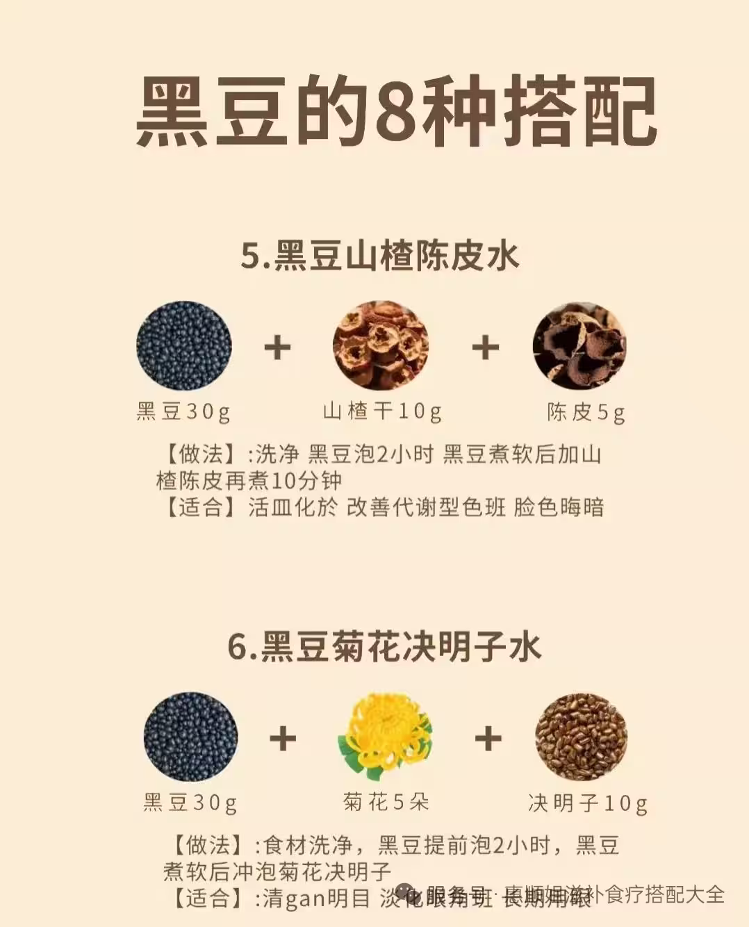 做法:黑豆30g、山楂干10g、陳皮5g,洗凈後黑豆泡2小時,煮軟後加山楂陳皮再煮10分鐘。